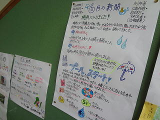 中央階段にたくさんの校内新聞を掲げています。水泳に関する記事では、それぞれの学年にインタビューした内容が記されていますよ。