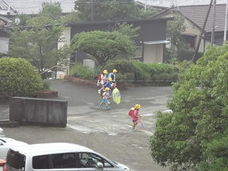心配されていた大雨・・・!登校時には、うっすら太陽の影が雲の隙間から見えていました。子供たちは傘を畳んで登校!