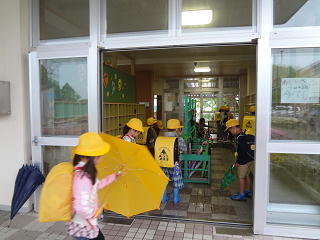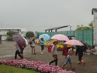 子供たちは、元気に登校!1年生は、自分で傘をたたんで決まった場所にきちんと置いていました。一つ一つ学校に慣れていくようです。