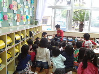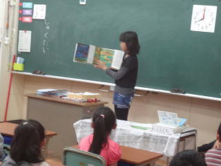 1年生の教室で読み聞かせ!少しづつ慣れていくようです。1年生は嬉しくて身を乗り出して聞いています。