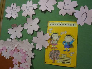 学年の掲示板には、2年生が描いた春が掲げられています。みんなが集まってくる楽しい春です。