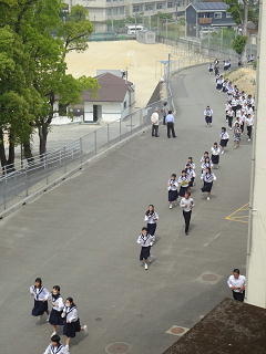 運動場で遊んでいた子供たちは指定された場所にすみやかに避難しました。