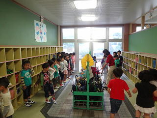 みんなで貨物列車をつくって「シュッシュッ♪・・・」と歌いながら活動しました。楽しそうでしたよ。