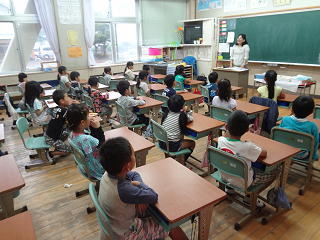 先生の話にしっかり耳を傾けているようでした。今日は、あいさつや雨の日の登下校や休み時間のすごし方等について学んでいたようです。
