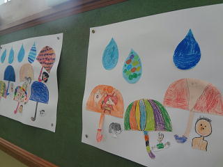 2年生のコーナーには、この時期ならではの絵が掲げられています。カラフルな傘たちが集まってますね。