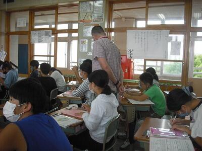 6年生の外国語の授業では、夏の風物詩「七夕飾り」を使って、願い事を英語で書く学習を行いました。