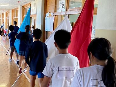 各団の色が決まった後、団長・副団長が各学年の廊下を歩きながら、団旗を披露しました。