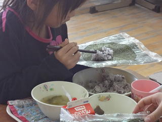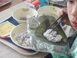 大きなのりに、ゆかりごはんを上手に巻いて・・・大きく口を開いて、頬張っていました。おいしかったですね!