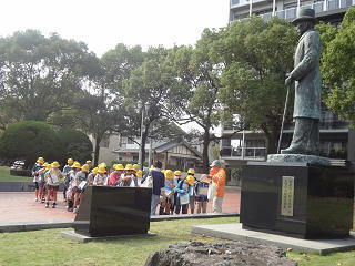 文化公園では宮崎の偉人の像の前で、係の方のお話を聞いて、見識を深めていました。公園の木々も色づき始めていました。