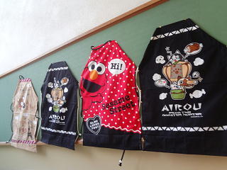 完成したエプロンが展示してありますよ。自分たちの選んだ柄で仕上げもきれいです。