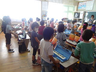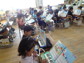 鍵盤ハーモニカの奏法を学んでいました。真剣です。
