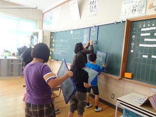 自分なりの解き方を小黒板に書き、発表していました。