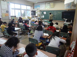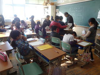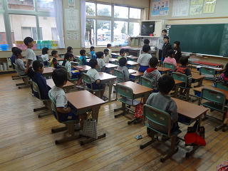 先生の説明に子供たちはじっと耳を傾けていました。1年生の真剣な学習が展開されています。