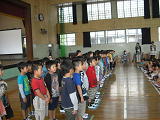 1年生にとっては、はじめての全校朝会。昨日、並び方の練習をしていたので、じょうずにならぶことができました。