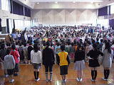 2年生以上のみなさんにとっては新しいクラスでのはじめての全校朝会。新鮮な気持ちでのぞんでたようです。全校そろってのはじめての校歌は、毎朝の練習の成果がみのり、元気な声がひびきました。校長先生のお話や生徒指導の先生のお話もしっかりきけました。
