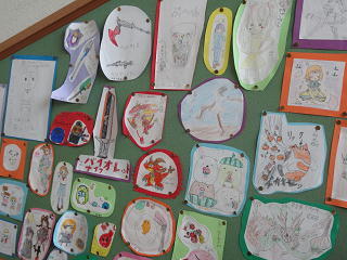 「宇宙船を作って宇宙に行ってみたいな・・・」それぞれの思いが絵になって表現されています。中央階段に掲げられていますよ。