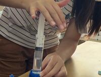 実験用のキットを使って確かめてみると、空気の体積は小さくなりますが、水の体積は変わらないということに気付くことができました。
