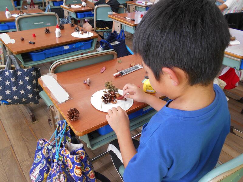 1年生の生活科では、秋を探しに校舎の周りを歩きました。植物や雲などを見て、秋の空気を身体いっぱい感じました!写真は、見つけた秋でおもちゃ作りをしている様子です。