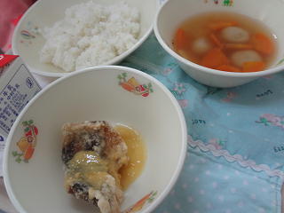ゆず味噌でお魚をいただきました。お芋のスープで体はぽかぽかになりました。美味しい給食・・いつもありがとうございます。