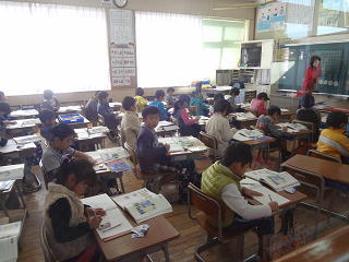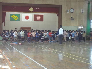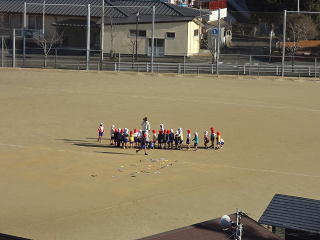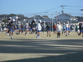 運動場で長縄を跳んでいました。クラス一丸となっての活動でした。