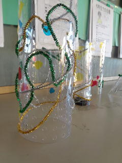 理科の時間に育てたヒョウタンが木質化し、カシュー塗料でマーブリングしました。木栓と飾りひもをつけて完成です。