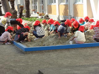 1年生は昼休みに砂場で遊んでいました。トンネルを作ったり・・・道を作ったり・・・。楽しそうでした。