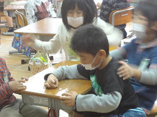 生活の時間に「冬の遊び」をしました。おしくらまんじゅうをすると、体がぽっかぽっかになりました。おにごっこをしたら、暑くなってきました。いつも一生けん命の1年生です。