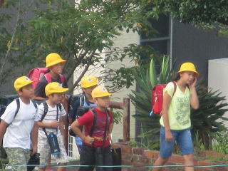 空は雲が広がり、太陽がかくれて、優しい光になりました。子供たちはいつもの登校班で元気に登校しました。