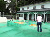 プール開き前日、最終チェックが行われました。すべりやすいところは念入りにブラシで磨きました。