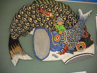 爽やかな五月の風が吹き、校長室前の掲示板には、こいのぼりが泳いでます!ここに来ると、表情豊かなこいのぼりをみることができますよ!力強いですね!こいのぼりにのってる男の子がいます。「かぶと」をかぶってますね?気づきましたか?この子供が嬉しそうにもっているのは、なんでしょう?