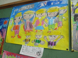 2年生の絵が掲げられています。元気いっぱいの姿や表情・・・とても上手に描けていますね。