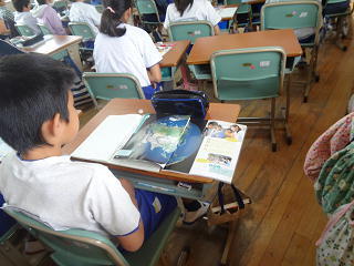 先生の説明をじっと聞き入っていました。自分たちを取り巻く世界に目を向ける活動でした。