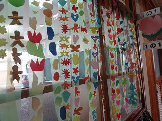 自分たちで切り抜いたいろんな型が飾られています。華やかです。