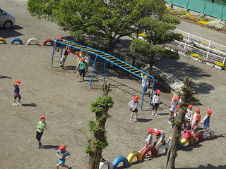 風かおる季節・・・。こいのぼりが元気に泳いでいます。中央にいる子どもは手になにか持っています。何でしょうね?校長室を通る時、見てくださいね。