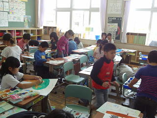 子供たちは、宿題や宅習・・・、読み声カードや連絡帳等、提出していました。1年生も6年生のサポートを受けて、いつもの場所に提出していました。
