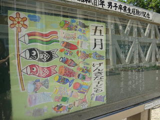 さわやかな風に乗るこいのぼり・・・、子供たちが描いた夢いっぱいのこいのぼりもたくさん泳いでいます。素敵な掲示ですね!