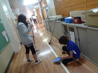 みんなの通る廊下をそうじしたり、1年生の傘やカッパのお世話をしたり、水で濡れた服を拭いてあげ、1年生を温かく迎え入れたりしていました。