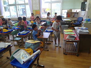 どの学年も健康の状態を先生に報告したり、夏休みの出来事を話したり等していましたよ。