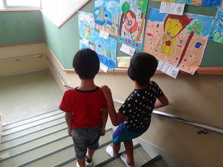 読書感想画がたくさん掲げてあります。絵から本を想像するのも楽しいですね。