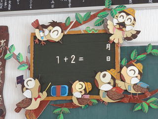 小鳥たちもあつまり、すでに算数の学習を始めています。黄色い帽子をかぶり、その表情は学校にやってきた喜びに満ちていますね。