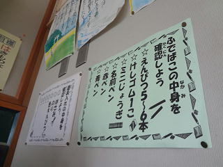 職員は、掲示物を貼ったり・・・、教材や備品を確認したりしています。