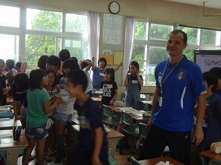 サッカー・ワールドカップウエアに身をつつんだロミト先生!子供たちとの活動は熱をおびています。子供たちは楽しくてたまらない様子でした。