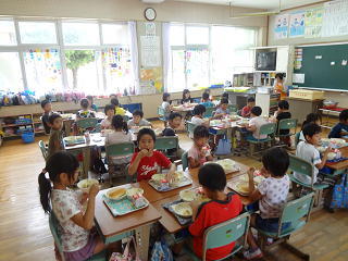 6年生が1年生をしっかりとサポートして、給食の準備を行っています。1年生は静かに待っていましたよ。・・・そしてみんなで美味しくいただいていました。