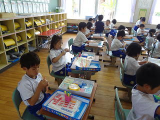 小学校に入学して初めての遠足です。天気はいいし弁当おいしいな。
