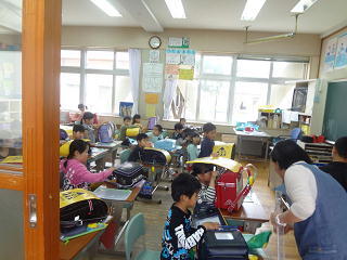 先生から一つ一つ学んでいます。荷物の置き場所・・・ランドセルの置き場所等・・・、子供たちは懸命に学んでいますよ。