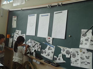 「ポスター制作」を始めました。先生の示された資料等を参考にしながら構成を考えていたようです。