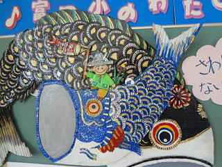 風かおる季節・・・。こいのぼりが元気に泳いでいます。中央にいる子どもは手になにか持っています。何でしょうね?校長室を通る時、見てくださいね。