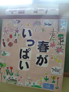 学年の掲示板には、2年生が描いた春が掲げられています。みんなが集まってくる楽しい春です。