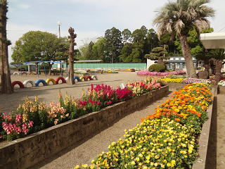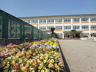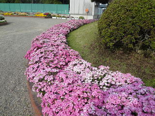 玄関前の庭・・・。花の首飾りをかけた様です・・・。なでしこのやさしい桃色が学校全体を華やかで明るくしています。