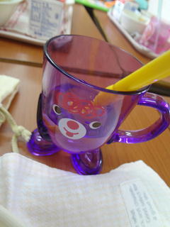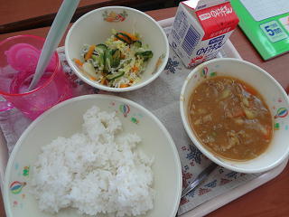 メインはカレー!みんなで美味しく頂きました。・・・そして、お気に入りのマイ歯ブラシとコップで丁寧に歯磨きを行いました。
